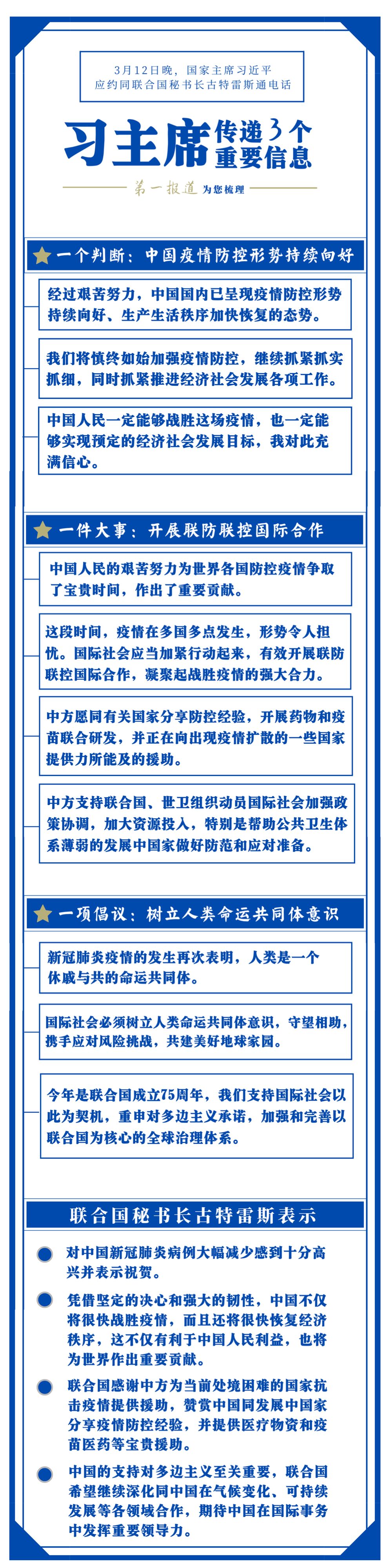 对疫情防控国际合作这件大事,习主席一直十分关心。此前,在内外事活动中,他曾多次提及。这一次同古特雷斯通电话,习主席有更明确阐述。