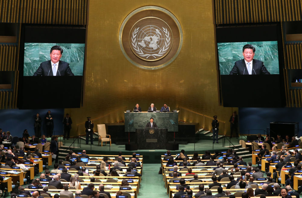 2015年9月28日,国家主席习近平在纽约联合国总部出席第70届联合国大会一般性辩论并发表题为《携手构建合作共赢新伙伴 同心打造人类命运共同体》的重要讲话。新华社记者庞兴雷摄