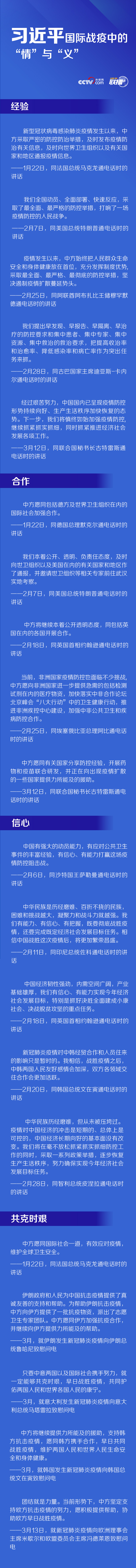 人类是一个命运共同体。战胜关乎各国人民安危的疫病,团结合作是最有力的武器。疫情发生以来,习近平先后与10多位国际政要通过电话、慰问电等形式围绕新冠肺炎疫情进行沟通。央视网《联播+》从四个关键词入手梳理,带您一起读懂习主席在国际战疫中传递出的“情”与“义”。