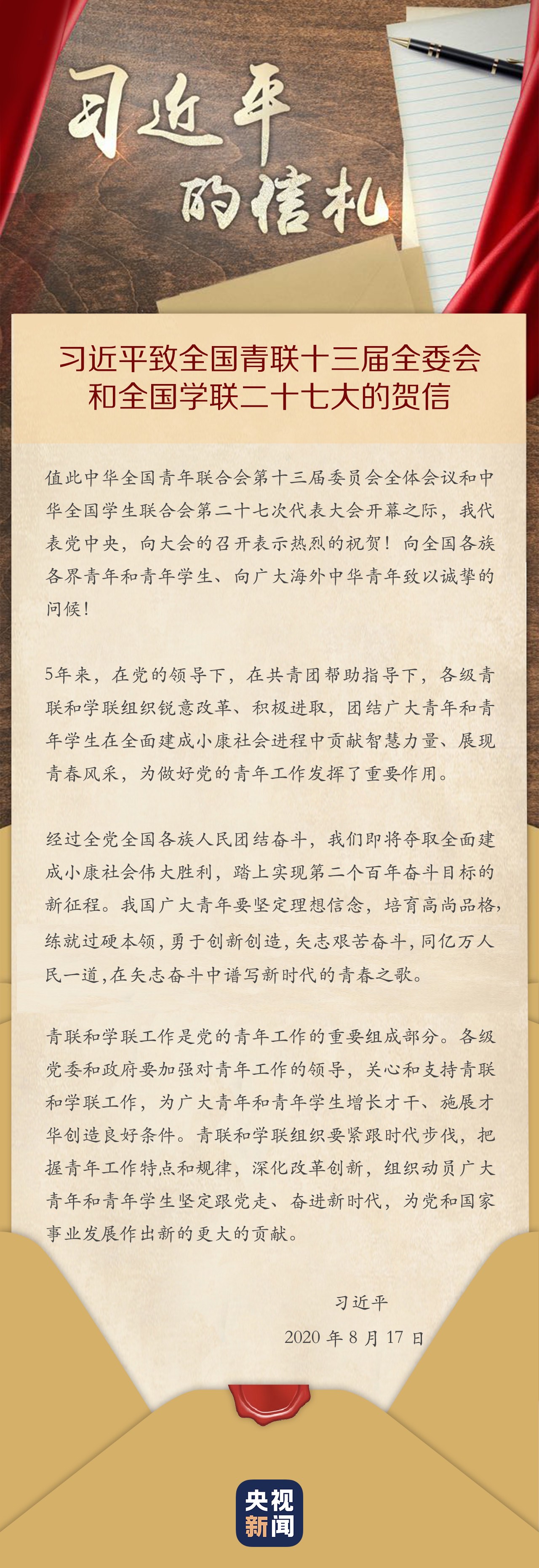 中华全国青年联合会第十三届委员会全体会议、中华全国学生联合会第二十七次代表大会8月17日在北京开幕。习近平总书记发来贺信,代表党中央,向大会的召开表示热烈的祝贺,向全国各族各界青年和青年学生、向广大海外中华青年致以诚挚的问候。