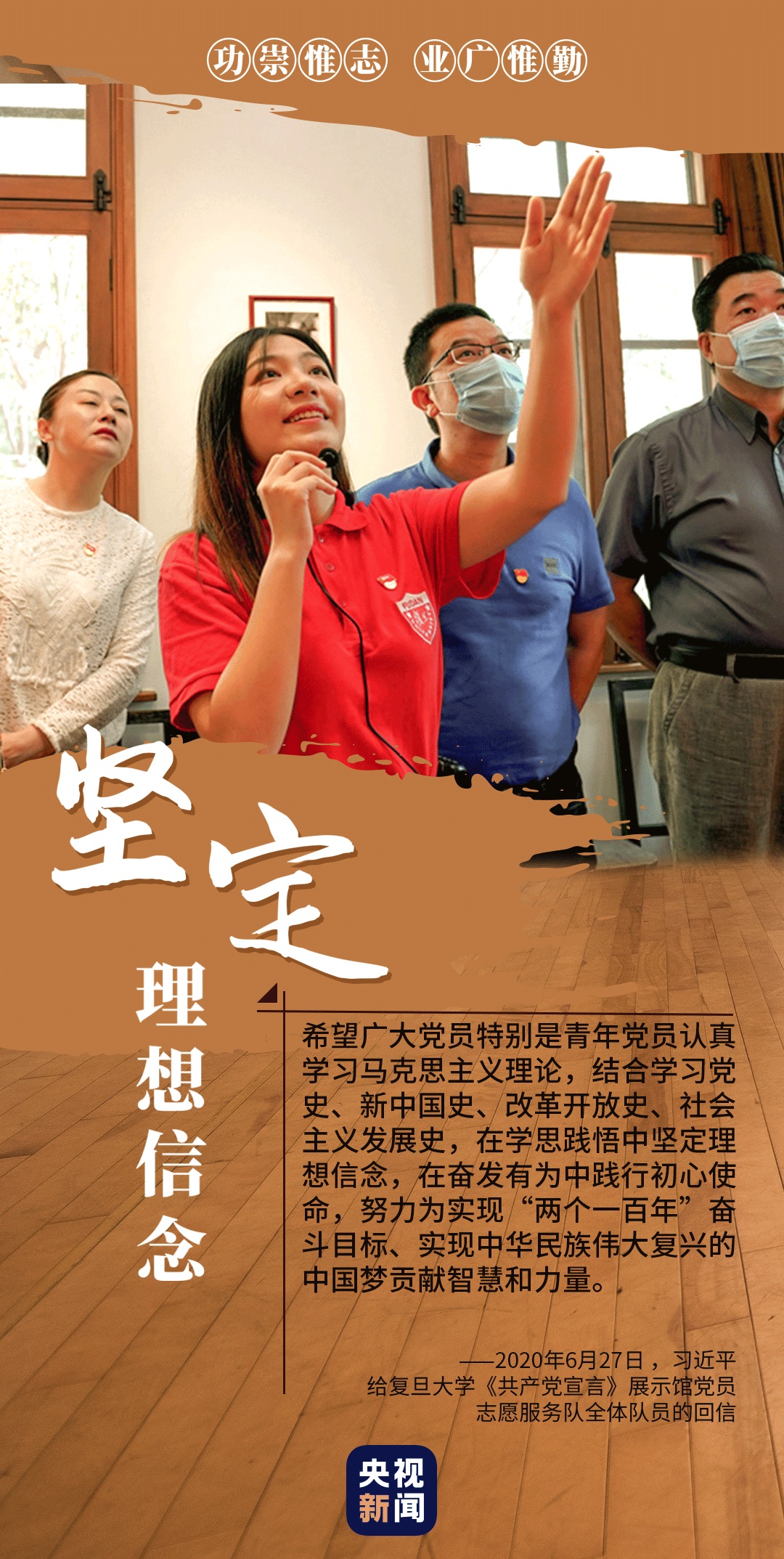心有所信,方能行远。2020年6月底,习近平在给复旦大学《共产党宣言》展示馆党员志愿服务队全体队员回信时说,面向未来,走好新时代的长征路,我们更需要坚定理想信念、矢志拼搏奋斗。