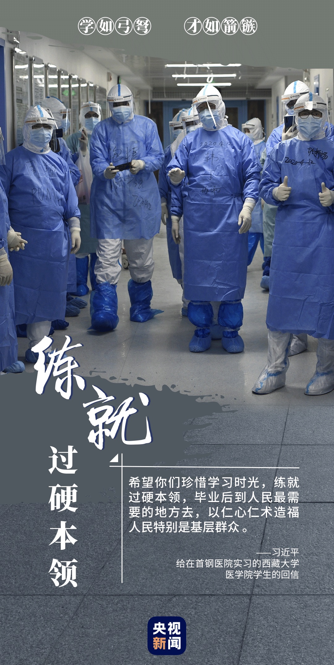 练过硬本领,做新时代奋斗者。在决胜全面小康、决战脱贫攻坚的收官之年,在实现“两个一百年”奋斗目标的历史交汇之年,新时代中国青年同亿万人民一道,在实现中华民族伟大复兴中国梦的新长征路上奋勇搏击。