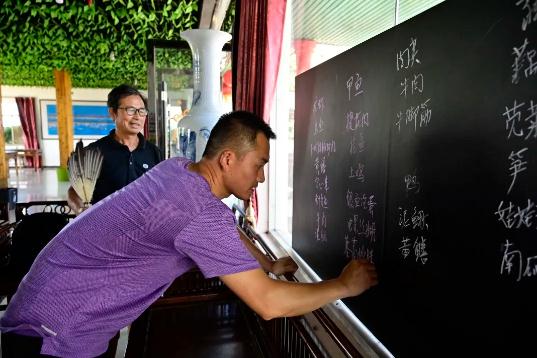 2020年 6月16日,在江西省余干县田园鄱阳湖景区,上岸渔民朱义才(左)在自己开办的农家乐内和儿子一起写当日的菜谱。(新华社记者 彭昭之 摄)