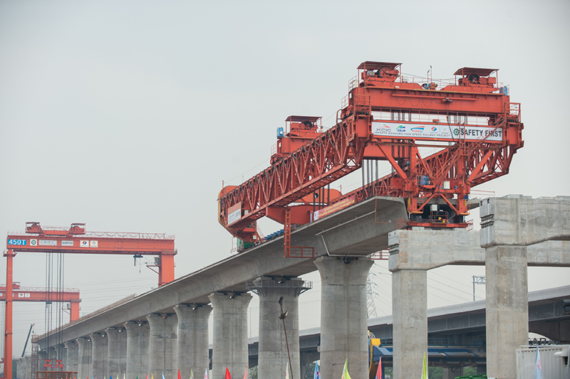 △2020年9月2日,印度尼西亚雅万高铁1号梁场,架梁机正在工作。