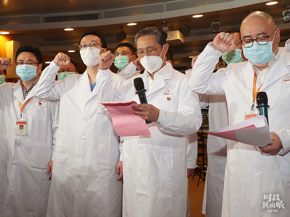 △2020年3月2日,广州医科大学附属第一医院,钟南山院士(右二)在首批战“疫”一线火线发展党员的入党宣誓仪式上领誓。