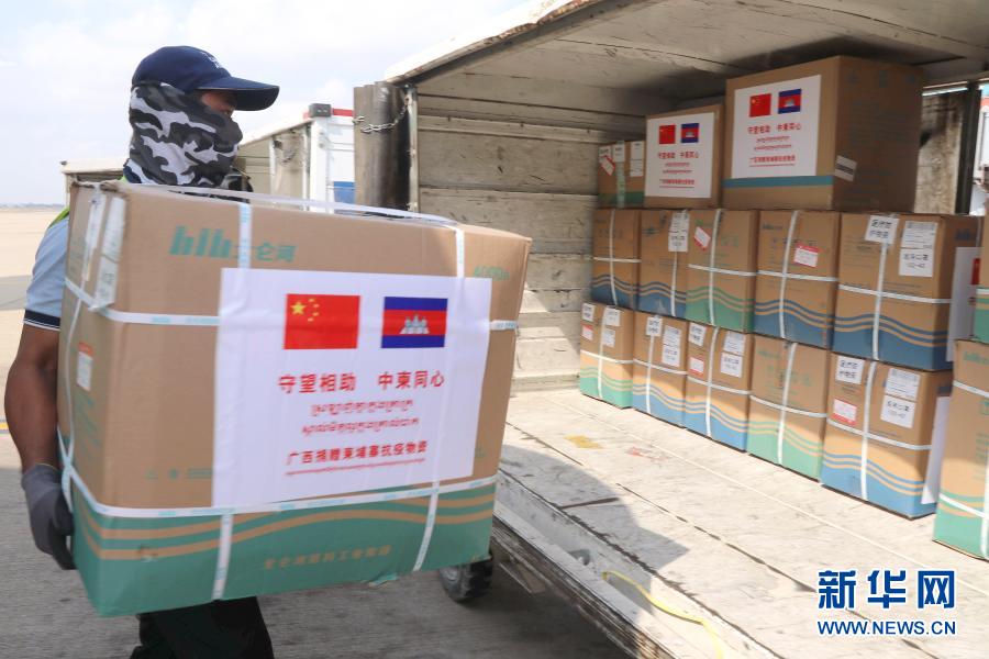 2020年3月23日,在柬埔寨首都金边,机场工作人员搬运中国援柬医疗物资。新华社记者 毛鹏飞 摄