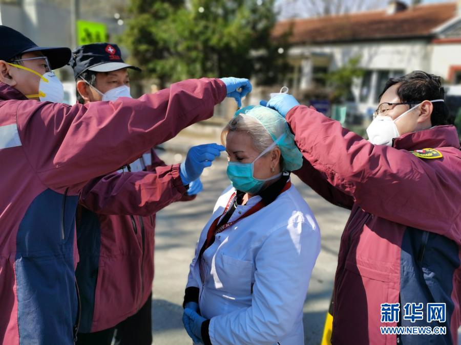 2020年4月4日,中国赴塞尔维亚抗疫医疗专家组在贝尔格莱德的基层发热门诊为门诊主任特里富诺维奇(中)更换防护标准更高的口罩。新华社发