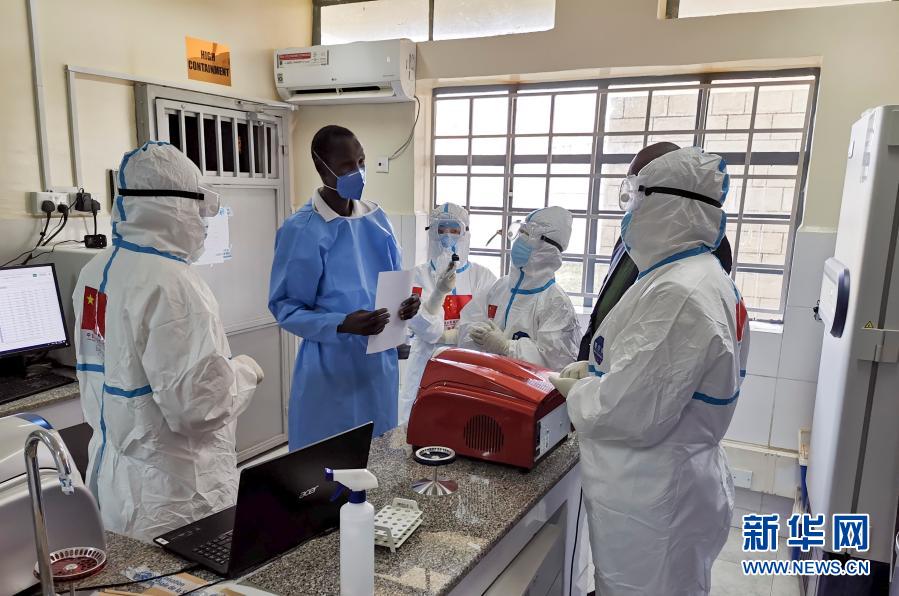 2020年8月21日,在南苏丹首都朱巴的一处新冠病毒检测机构,中国抗疫医疗专家组成员与南一线医护人员交流。新华社发(中国驻南苏丹大使馆供图)