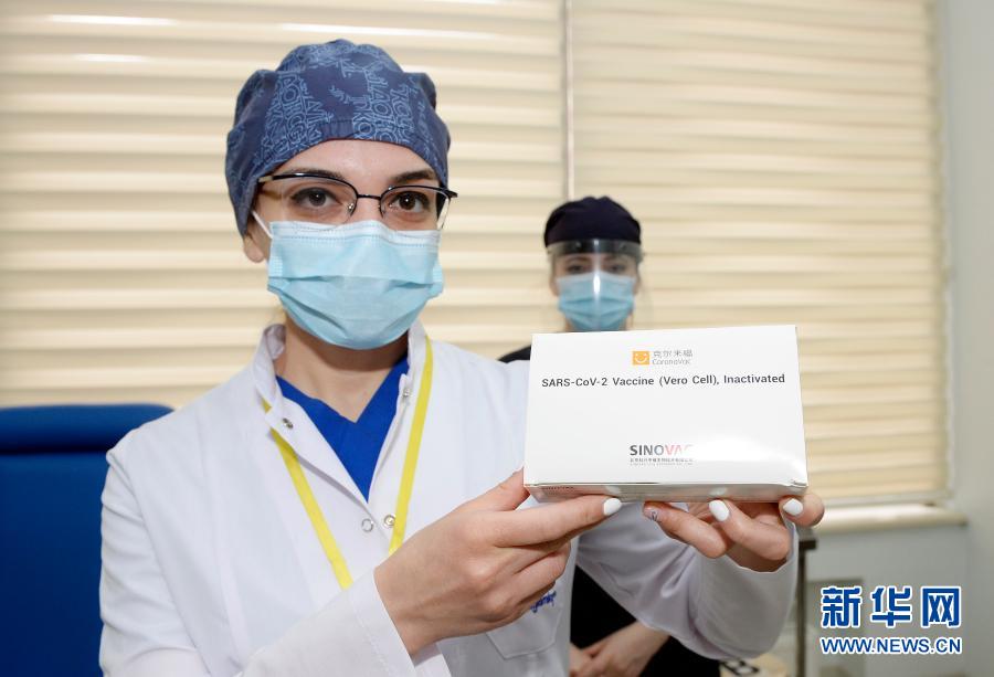 2021年1月18日,在阿塞拜疆首都巴库,一名医务人员展示中国科兴公司生产的新冠疫苗。新华社发(巴巴耶夫摄)