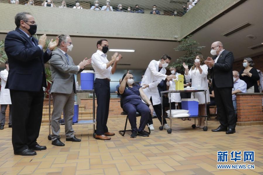 2021年1月18日,巴西圣保罗州坎皮纳斯市首名接种者、49岁的女护士利亚娜蒂诺科(中)在接种中国新冠疫苗。新华社发(圣保罗州政府供图)