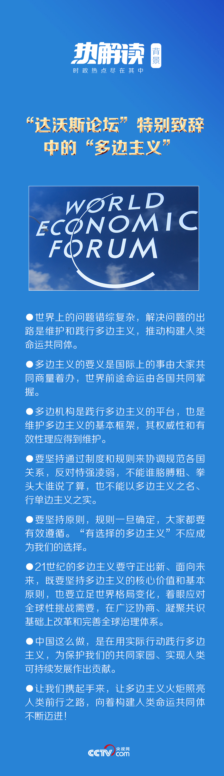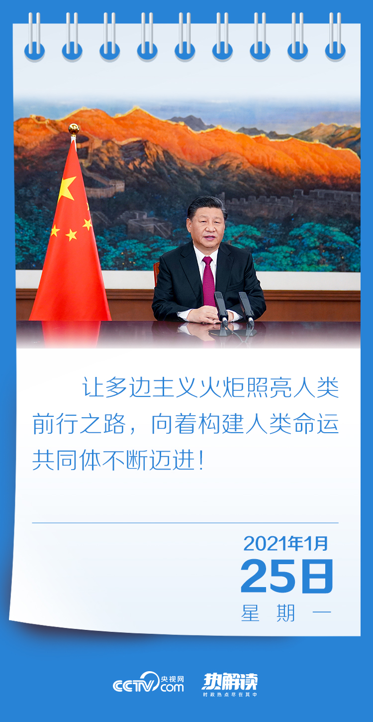 热解读 1月25日晚,习近平主席在北京以视频方式应邀出席世界经济论坛“达沃斯议程”对话会,并发表题为《让多边主义的火炬照亮人类前行之路》的特别致辞。