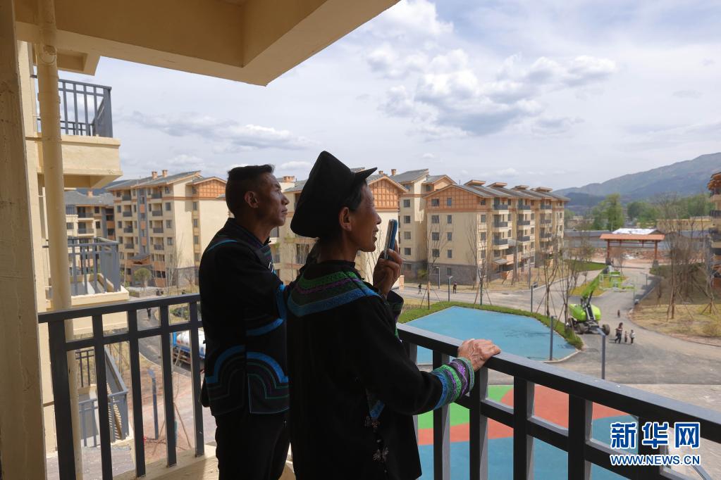 在四川省昭觉县城易地扶贫搬迁安置点南坪社区,刚搬迁到新家的“悬崖村”村民莫色达体夫妇在阳台给亲戚打电话(2020年5月13日摄)。新华社记者 江宏景 摄