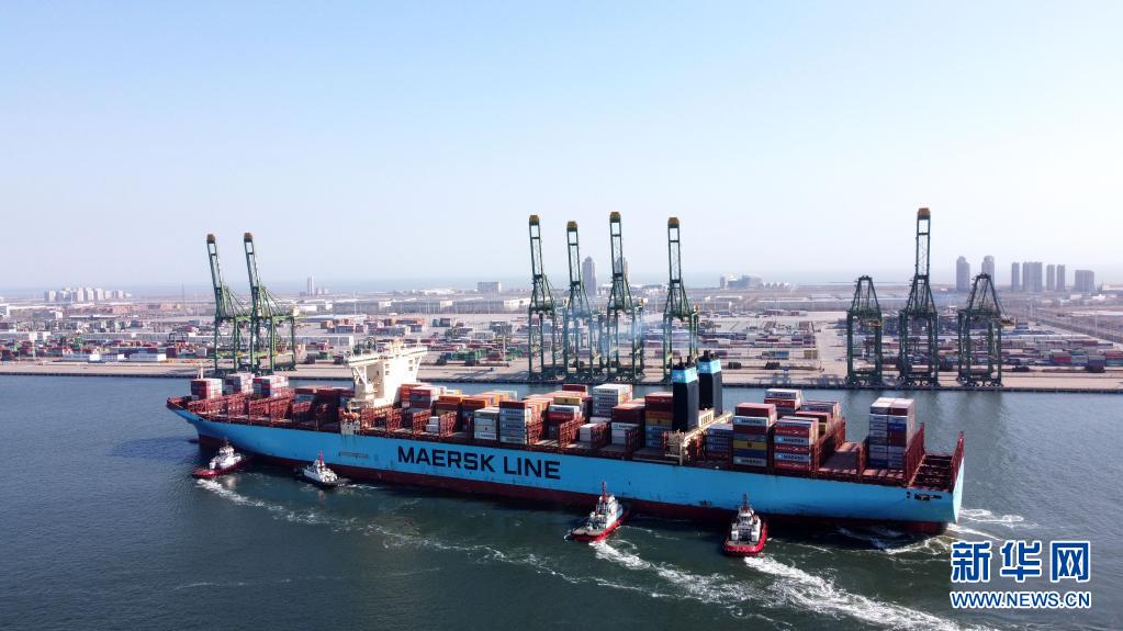 一艘载有集装箱的货轮驶入天津港码头(2月22日摄,无人机照片)。新华社记者 赵子硕 摄