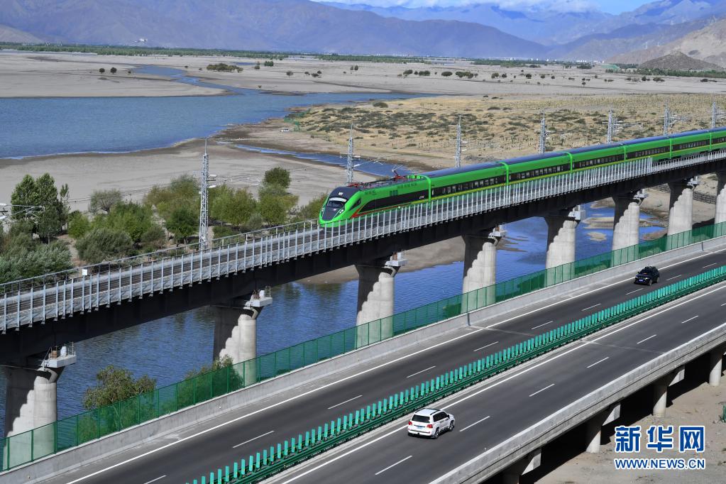 试运行的复兴号列车行驶在雅鲁藏布江畔(6月16日摄)。新华社记者 觉果 摄