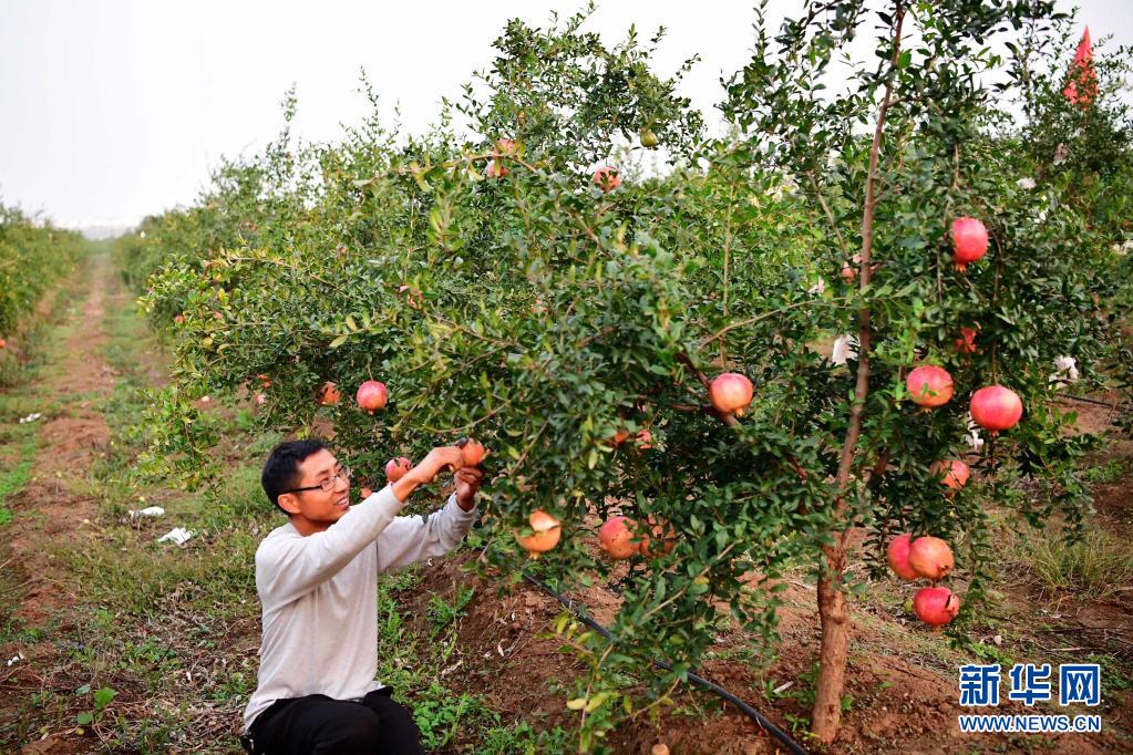 在河南省南阳市淅川县九重镇,软籽石榴基地的工作人员在采摘石榴(2019年10月19日摄)。新华社记者 冯大鹏 摄