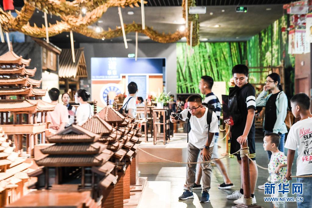 参观者在广西民族博物馆里参观风雨桥模型(2019年10月4日摄)。新华社记者 曹祎铭 摄