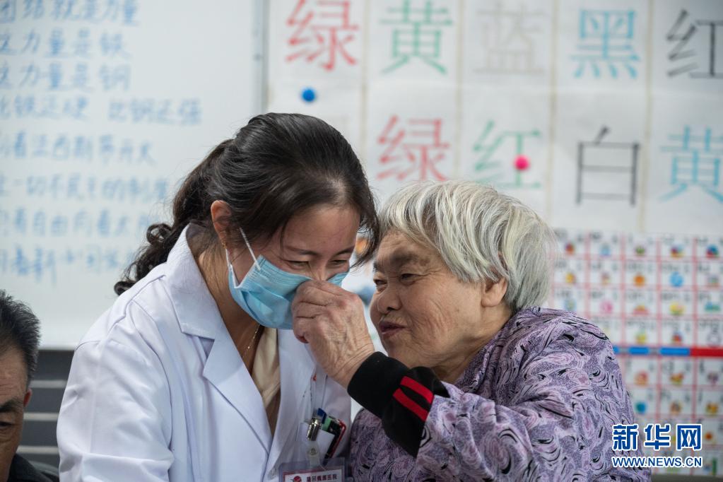 在湖南省邵阳市隆回县隆回魏源医院,一名老年公寓的老人跟医护人员亲密交流(2020年10月12日摄)。新华社记者 才扬 摄