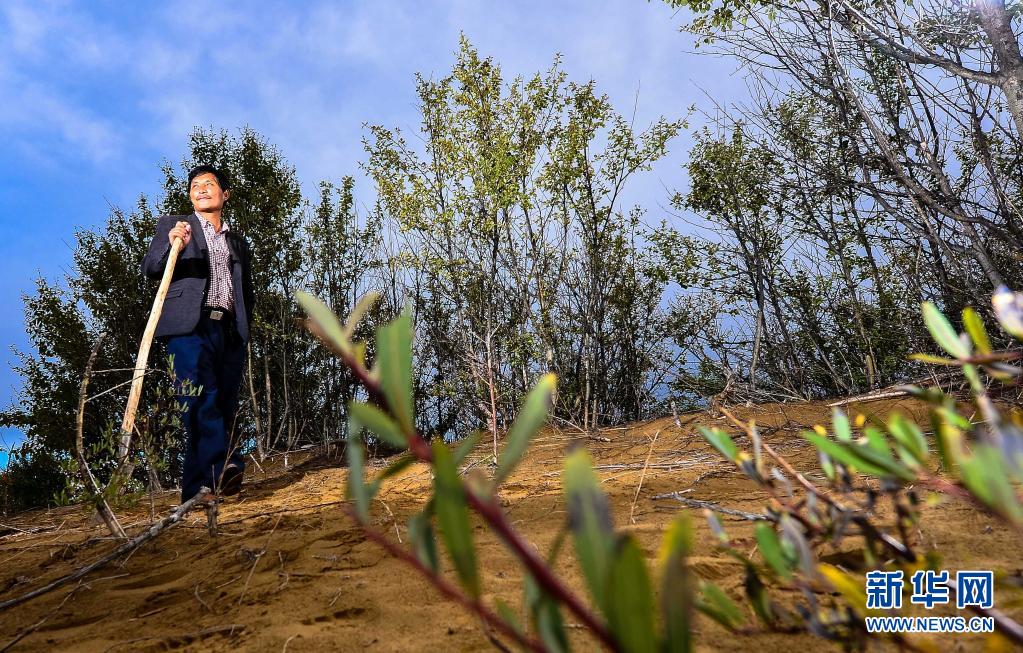 在青海省贵南县森多乡,生态管护员吉本加在巡查黄沙头防风林(2013年9月10日摄)。新华社记者 吴刚 摄