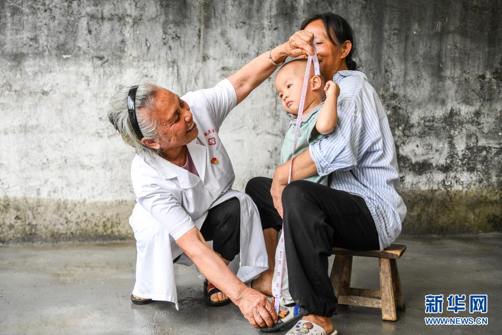 广西贺州市钟山县两安瑶族乡竹梅村的乡村医生王秋姣(左)上门体检时给小朋友测量身高(5月11日摄)。新华社记者 曹祎铭 摄