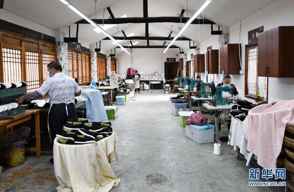 在四川省成都市郫都区唐昌镇战旗村,工人们加紧制作布鞋(2020年4月17日摄)。新华社记者 王曦 摄