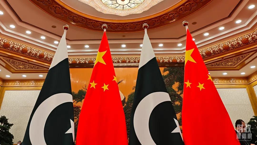 △会谈现场摆放的巴基斯坦国旗和五星红旗。(总台央视记者杨立峰拍摄)