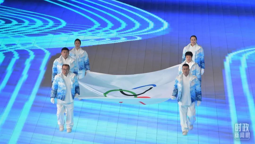 △北京冬奥会开幕式上,6名旗手手执奥林匹克会旗入场。(总台记者廖江衡拍摄)