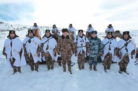 △2014年1月26日,习近平主席在内蒙古阿尔山与边防线上巡逻执勤的官兵合影。