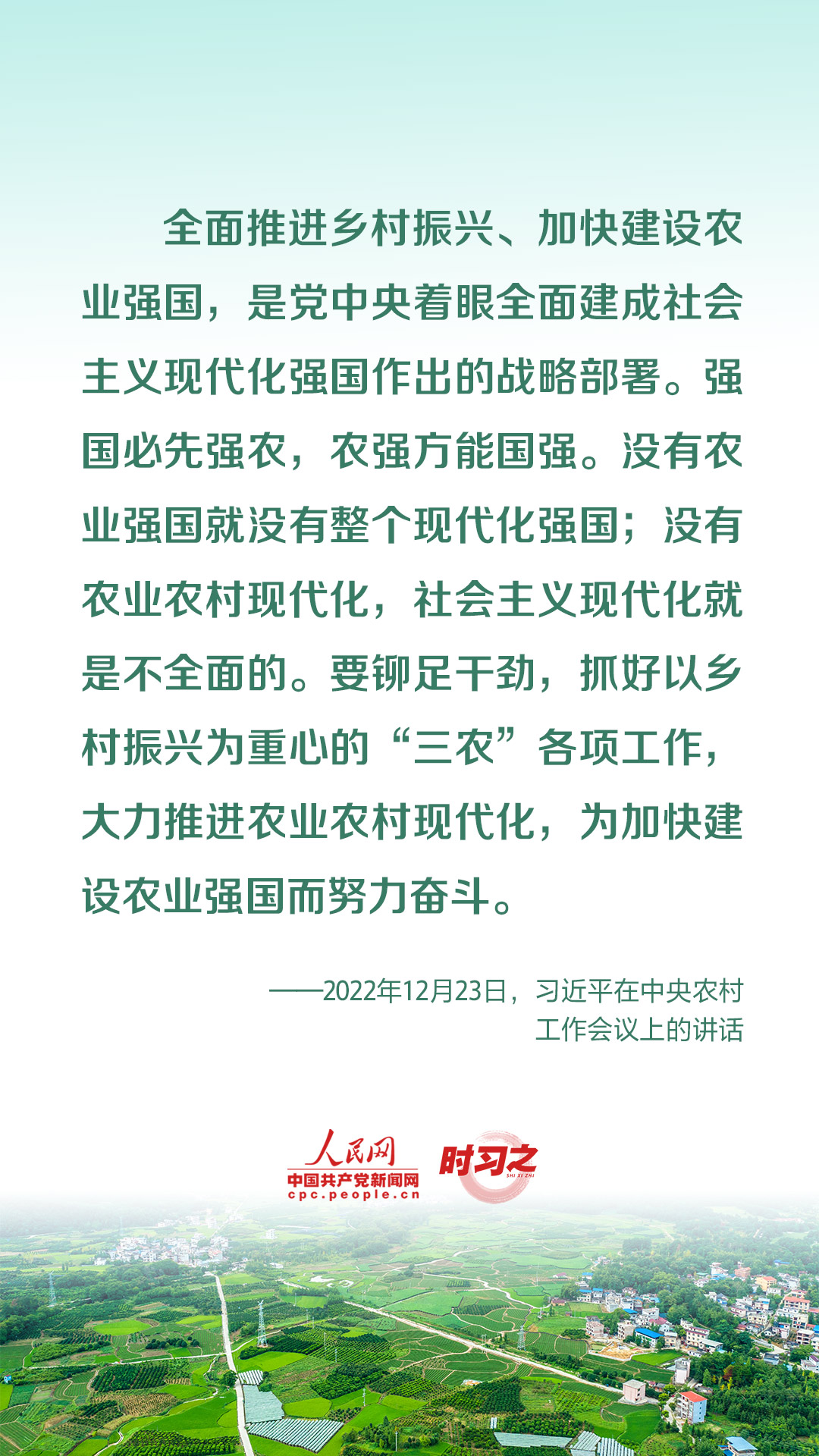 中央农村工作会议12月23日至24日在北京举行。中共中央总书记、国家主席、中央军委主席习近平出席会议并发表重要讲话强调,全面推进乡村振兴、加快建设农业强国,是党中央着眼全面建成社会主义现代化强国作出的战略部署。强国必先强农,农强方能国强。没有农业强国就没有整个现代化强国;没有农业农村现代化,社会主义现代化就是不全面的。要铆足干劲,抓好以乡村振兴为重心的“三农”各项工作,大力推进农业农村现代化,为加快建设农业强国而努力奋斗。