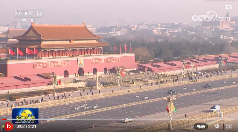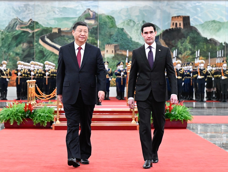 谢尔达尔·别尔德穆哈梅多夫在习近平陪同下检阅中国人民解放军仪仗队。