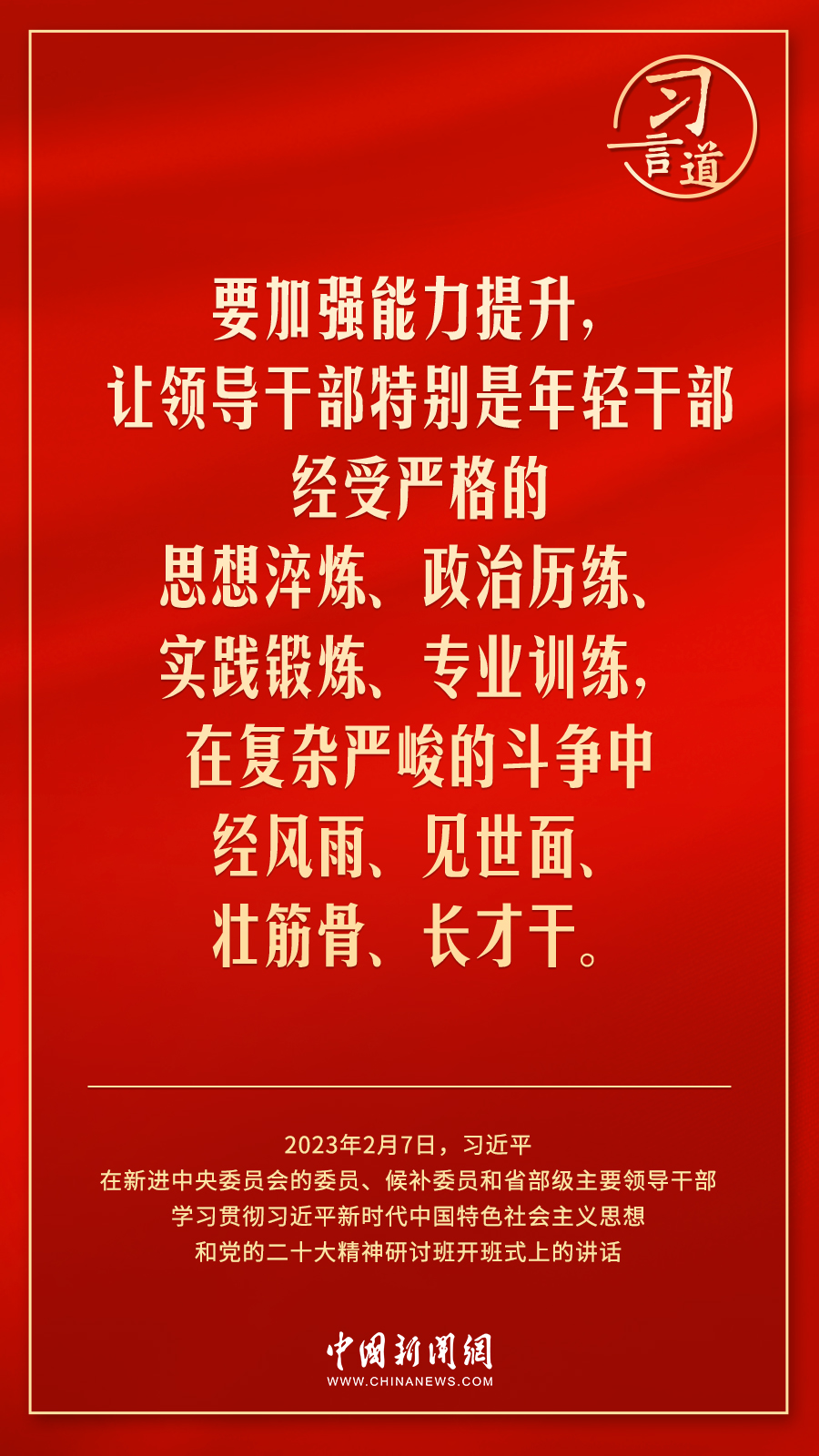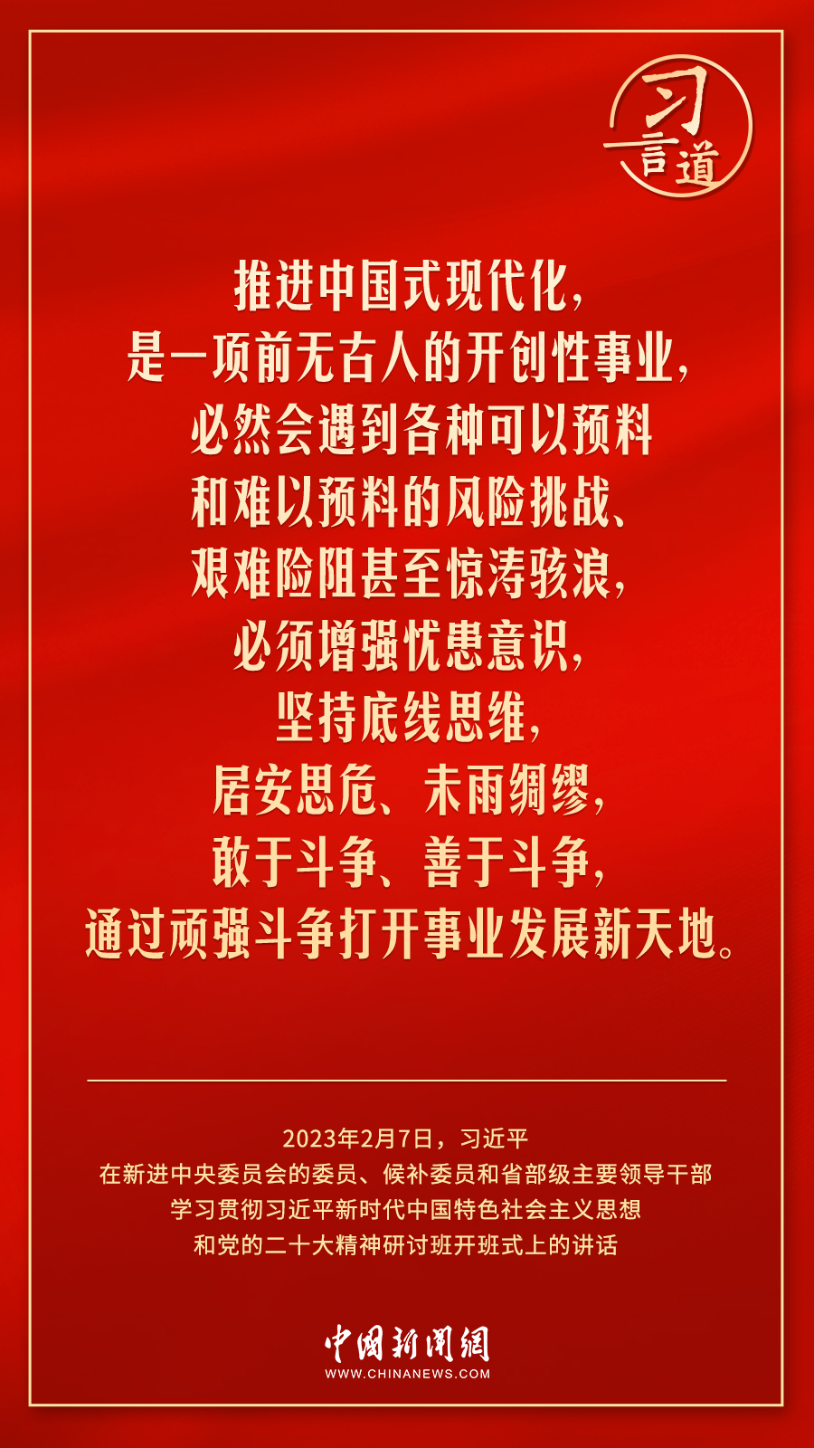 2月7日,新进中央委员会的委员、候补委员和省部级主要领导干部学习贯彻习近平新时代中国特色社会主义思想和党的二十大精神研讨班在中央党校(国家行政学院)开班。中共中央总书记、国家主席、中央军委主席习近平在开班式上发表重要讲话,他强调——