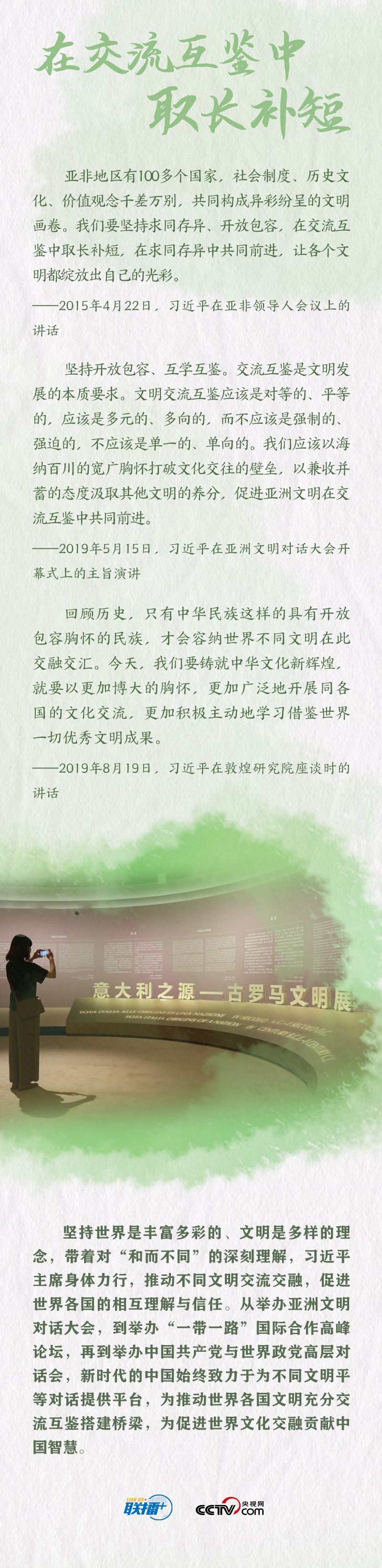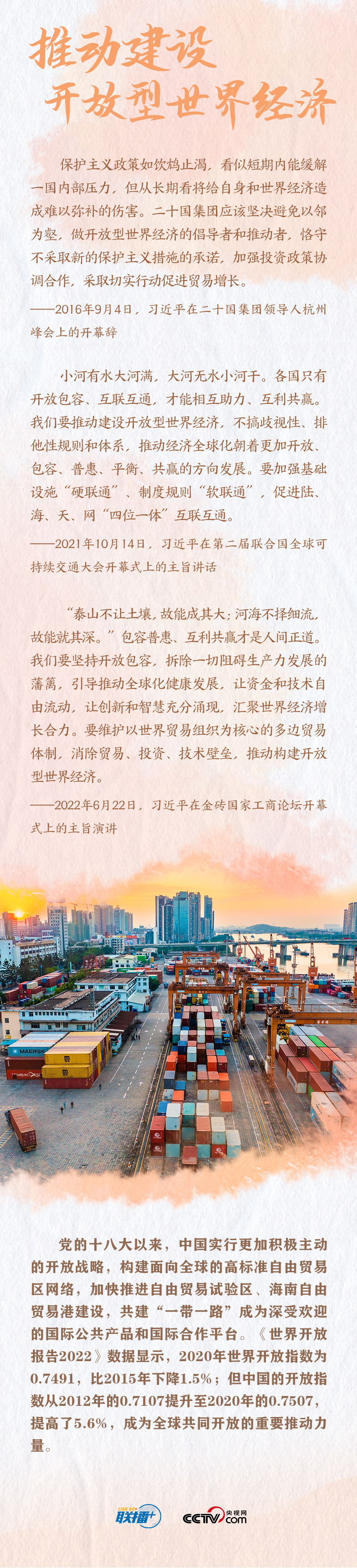 “开放是人类文明进步的重要动力,是世界繁荣发展的必由之路。”党的十八大以来,面对全球性挑战,习近平主席以世界眼光关注人类发展,主张“坚持交流互鉴,推动建设一个开放包容的世界”。