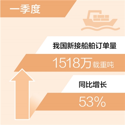 本报北京4月27日电(记者王政、刘志强)记者近日从工信部获悉:一季度,我国船舶工业经济运行企稳回升。统计数据显示,一季度,我国新接船舶订单量1518万载重吨,同比增长53%。截至3月底,手持订单量11452万载重吨,同比增长15.6%。
