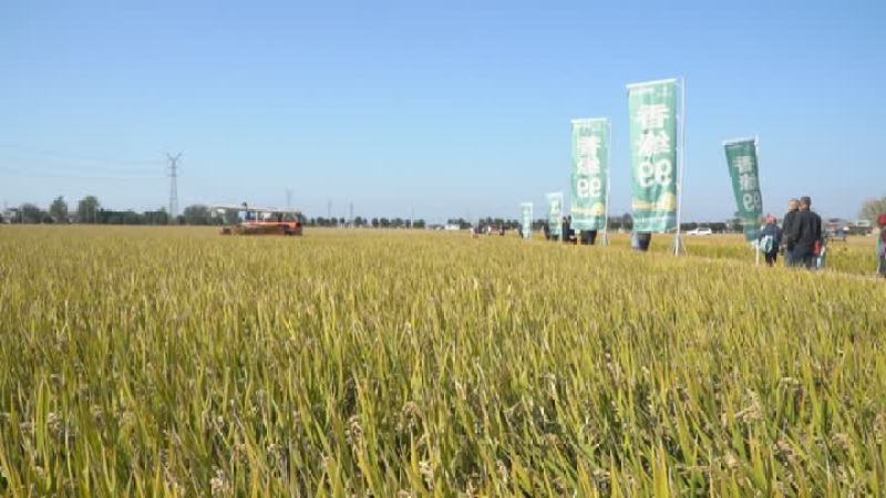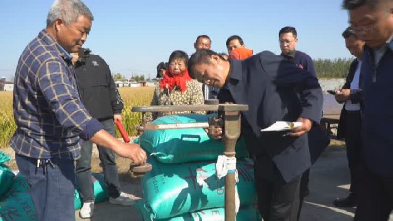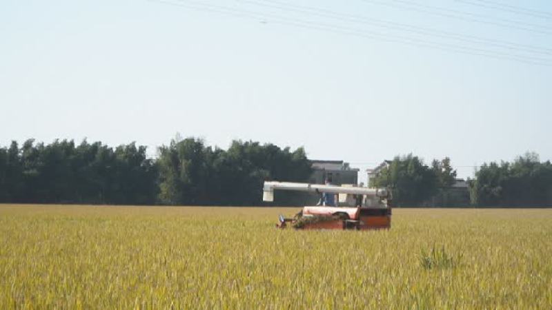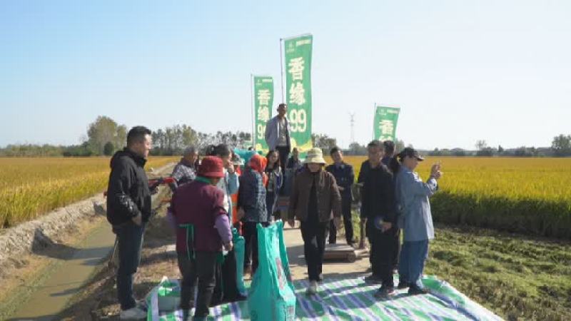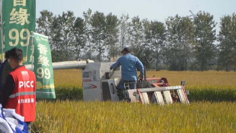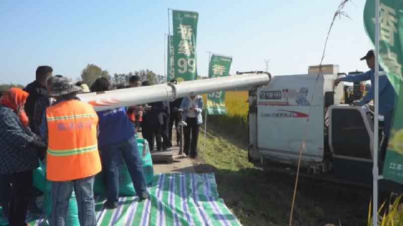 在位于扬州高邮市临泽镇的一处科创农保兴农示范方,趁着晴好天气这里正在进行秋收抢收,记者看到,收割机正在田间来回穿梭,农业专家和工作人员也在田间忙碌着,对这块示范方的产量进行评估。