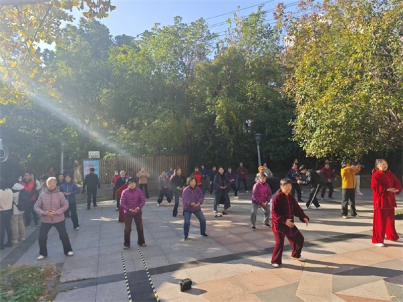 长虹路社区一家亲驿站广场上市民们打八段锦(央广网发 王锡斐 摄)