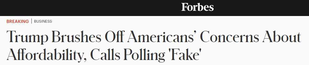 福布斯新闻网站报道称,本月早些时候的调查显示,超过四分之三的美国人对个人财务状况感到忧虑,而政府却质疑民调的真实性,称其为“虚假信息”。然而,多数民众正经历的是物价上涨带来的支出增加。尽管特朗普政府宣称“生活成本已大幅下降”,但电费、家具、电子产品及食品杂货等价格自其就职以来便普遍上涨。