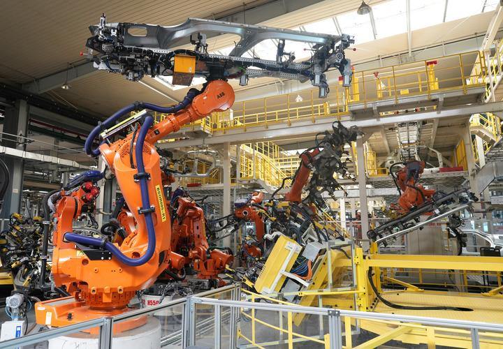 在位于浙江省临海市的吉利汽车制造基地,机械臂在焊装车间工作。新华社记者 翁忻旸 摄