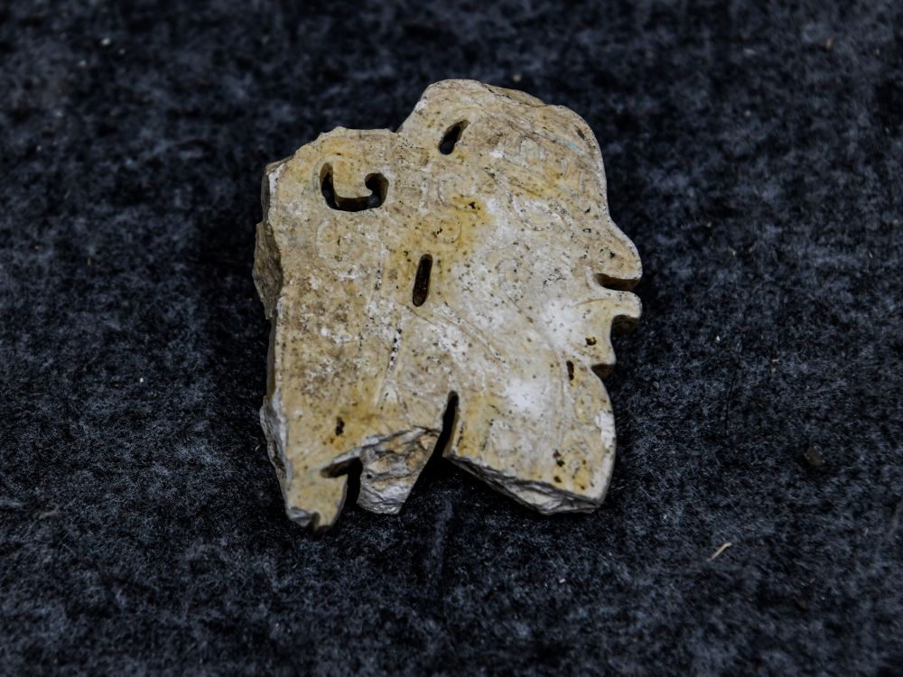 2024年7月10日在四川省文物考古研究院拍摄的三星堆遗址出土的玉石上阳刻的侧身人像。三星堆遗址新发现与玉石器生产加工相关的遗存,专家初步判断为玉石器“生产车间”,年代为商代中期,距今约3500年至3400年。
