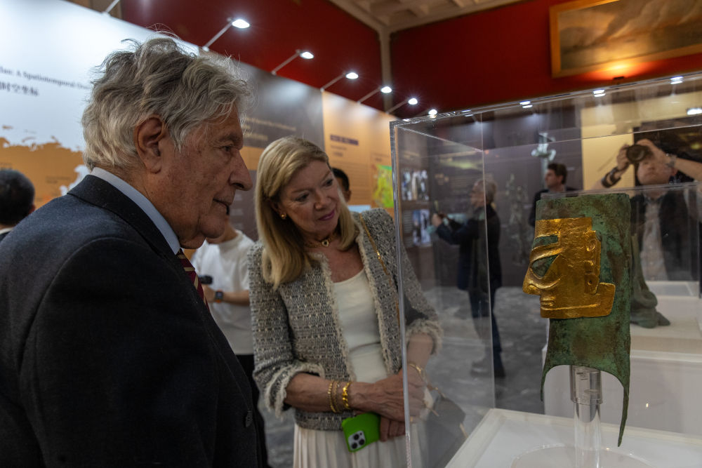 2025年5月13日,观众在希腊雅典新斯米尔尼市政博物馆参观“青铜之光——古蜀文明特展”。展览通过精美的文物复制品、3D打印技术和图文展示,生动呈现以三星堆—金沙遗址为代表的古蜀文明,吸引众多当地民众前来参观。