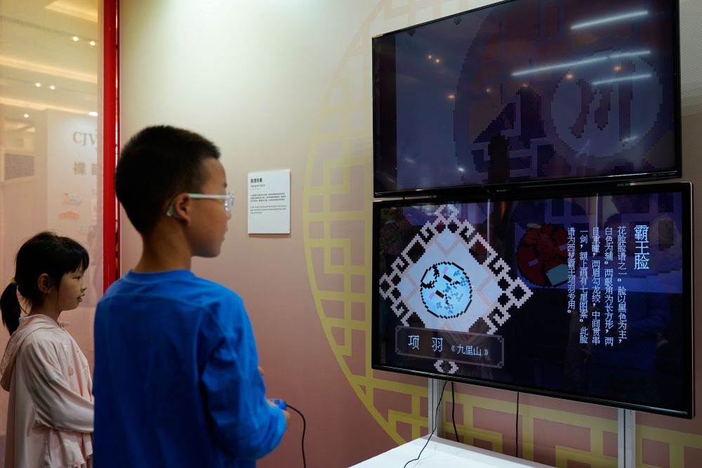 2025年5月31日,在第九届中国成都国际非物质文化遗产节上,小朋友通过互动游戏了解川剧脸谱。