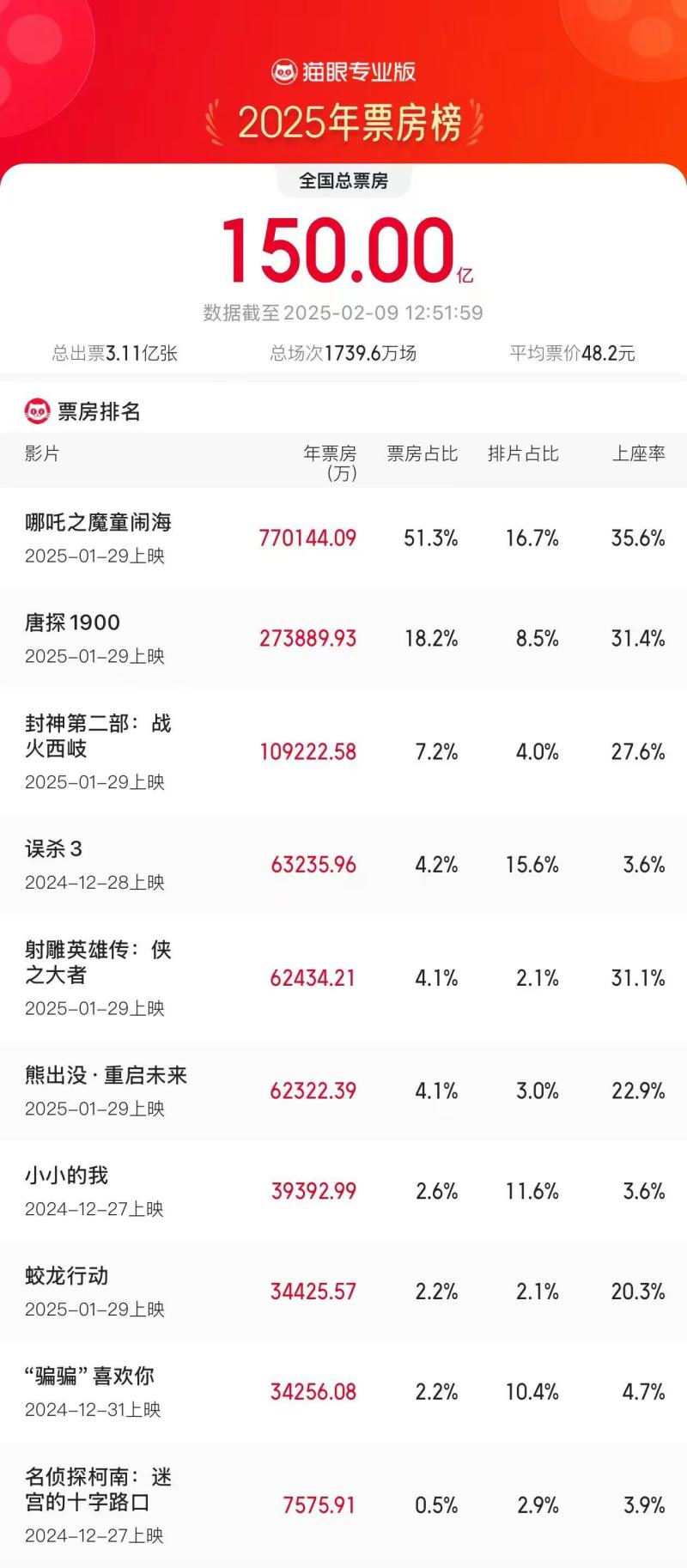 据网络平台数据,2025年2月9日12时51分,2025年度票房(含预售实时)破150亿,《哪吒之魔童闹海》以超51.3%的票房占比强势领跑年度票房榜!