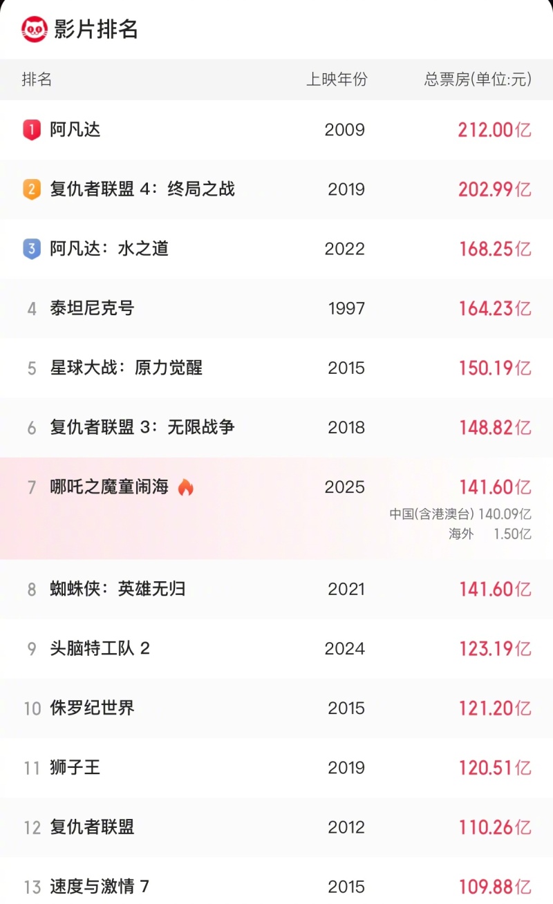 《哪吒2》票房冲上全球第7