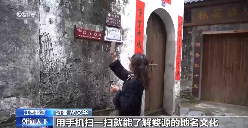 游客 胡文华:我觉得特别方便,用手机扫一扫就能了解婺源的地名文化。墙上的牌子也是古色古香,与村落特别和谐。