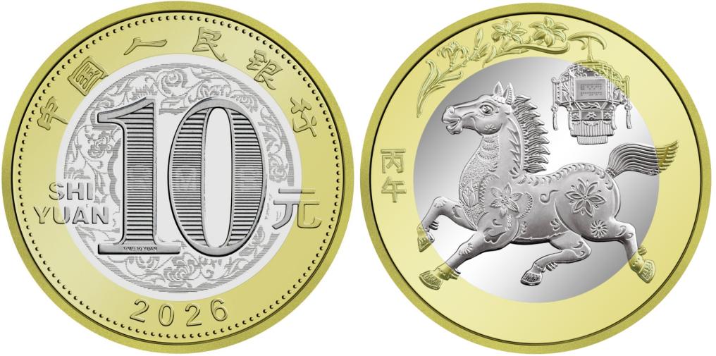 双色铜合金纪念币正面图案为“中国人民银行”“10元”字样,汉语拼音字母“SHIYUAN”及年号“2026”,底纹衬以团花图案。双色铜合金纪念币背面图案为中国传统剪纸艺术与装饰年画元素相结合的马形象,衬以花灯和萱草图案,币面左侧刊“丙午”字样。