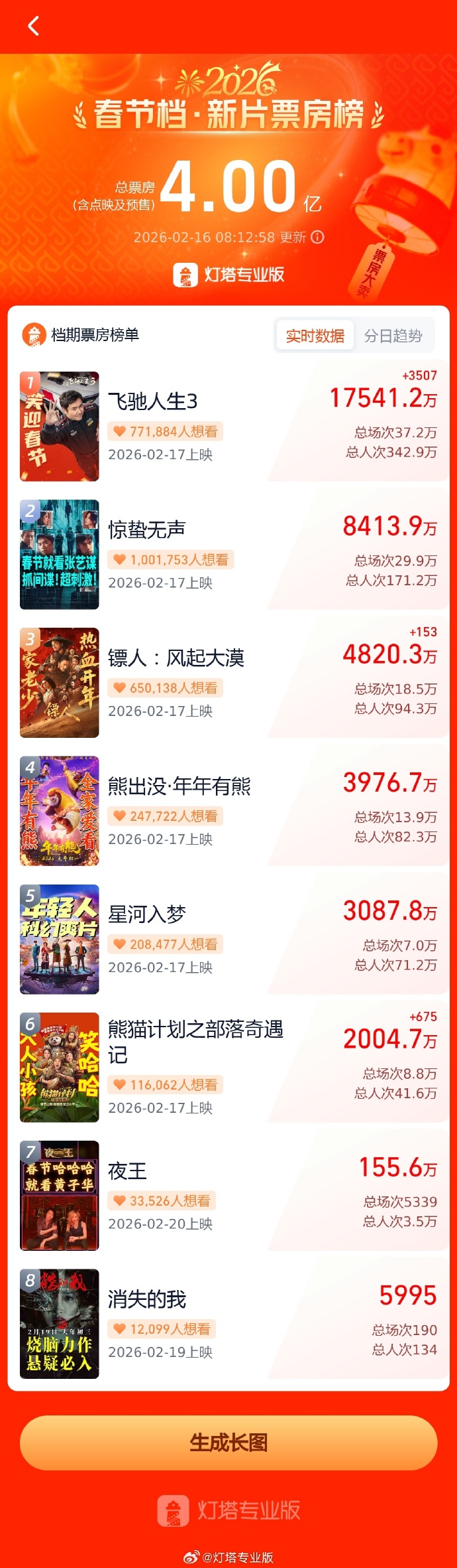 据灯塔专业版,截至2月16日8时12分,2026春节档新片预售总票房突破4亿!