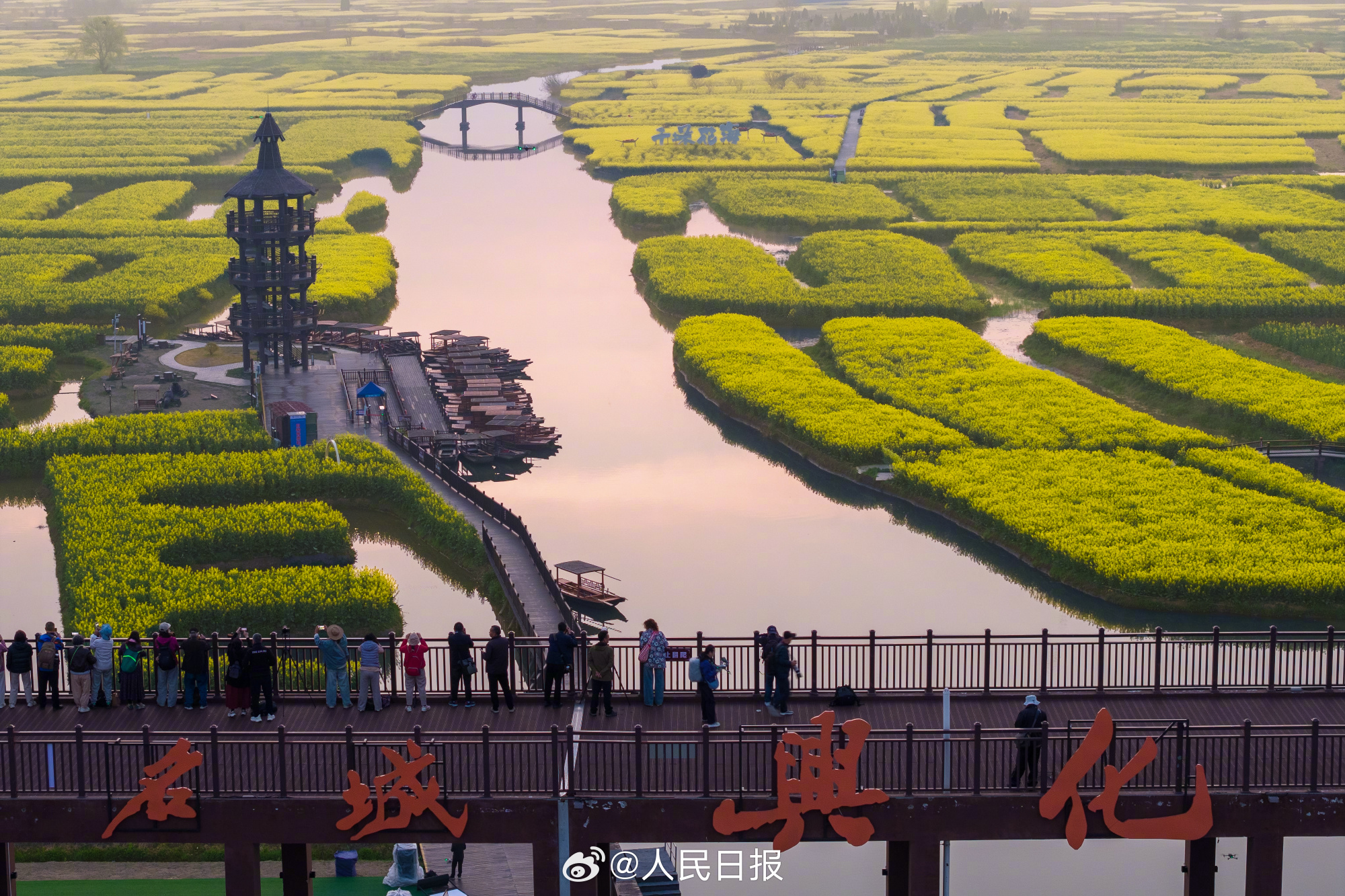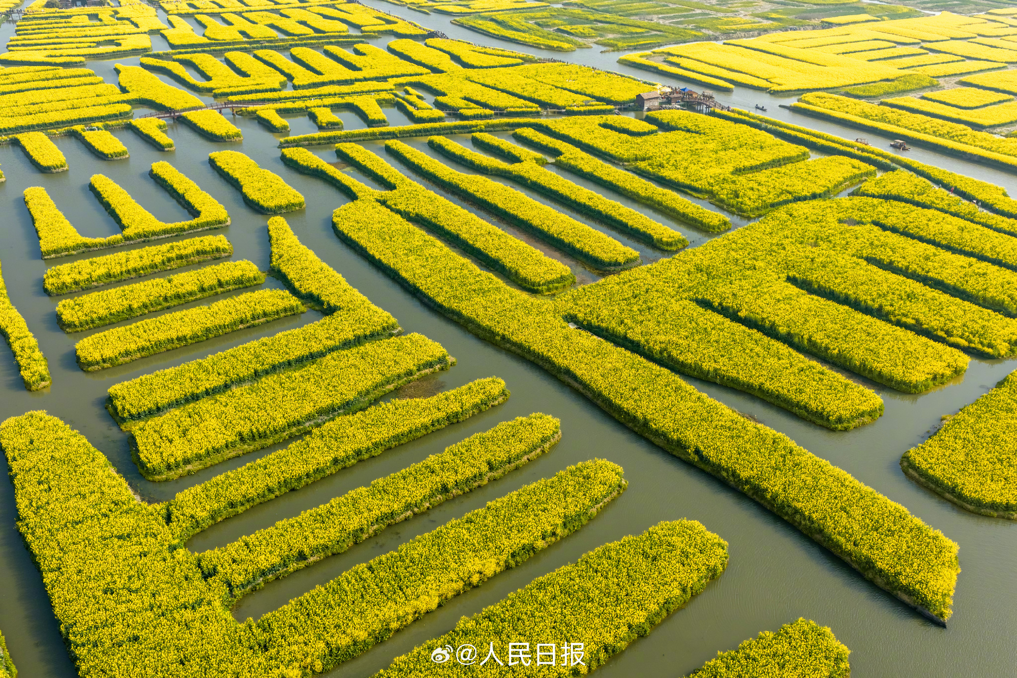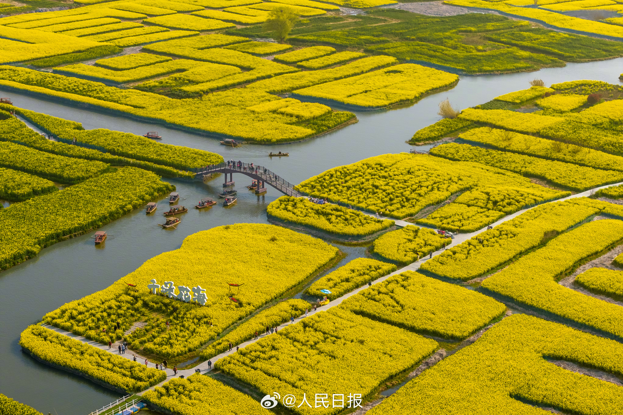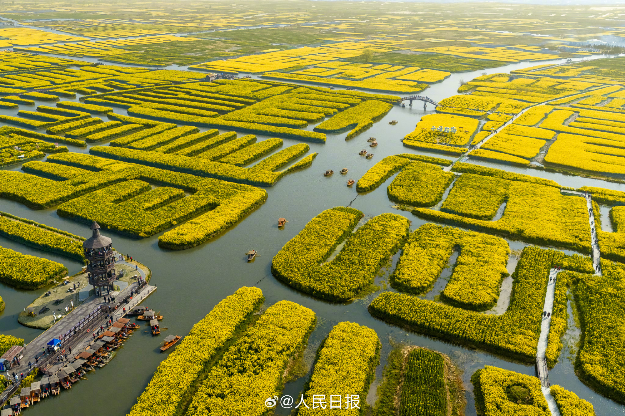 29日,江苏兴化千垛景区迎来今春盛放时刻。油菜花海进入全盛期,纵横交错的垛田如金色棋盘浮于水面,与澄澈碧水相映成趣。