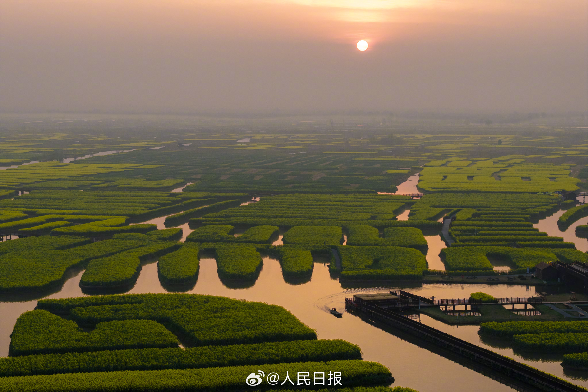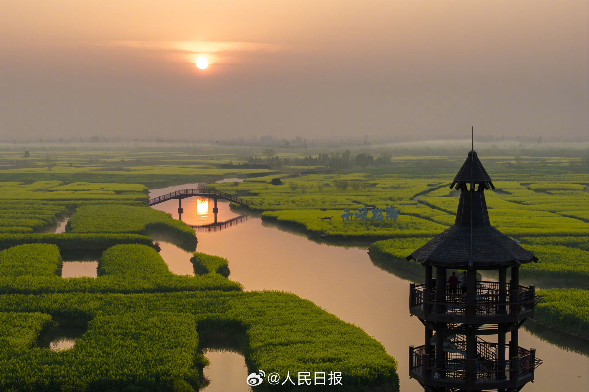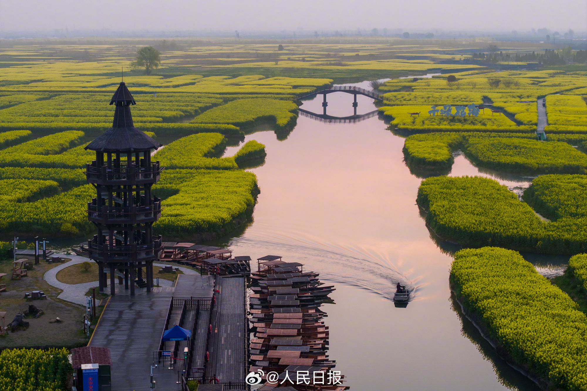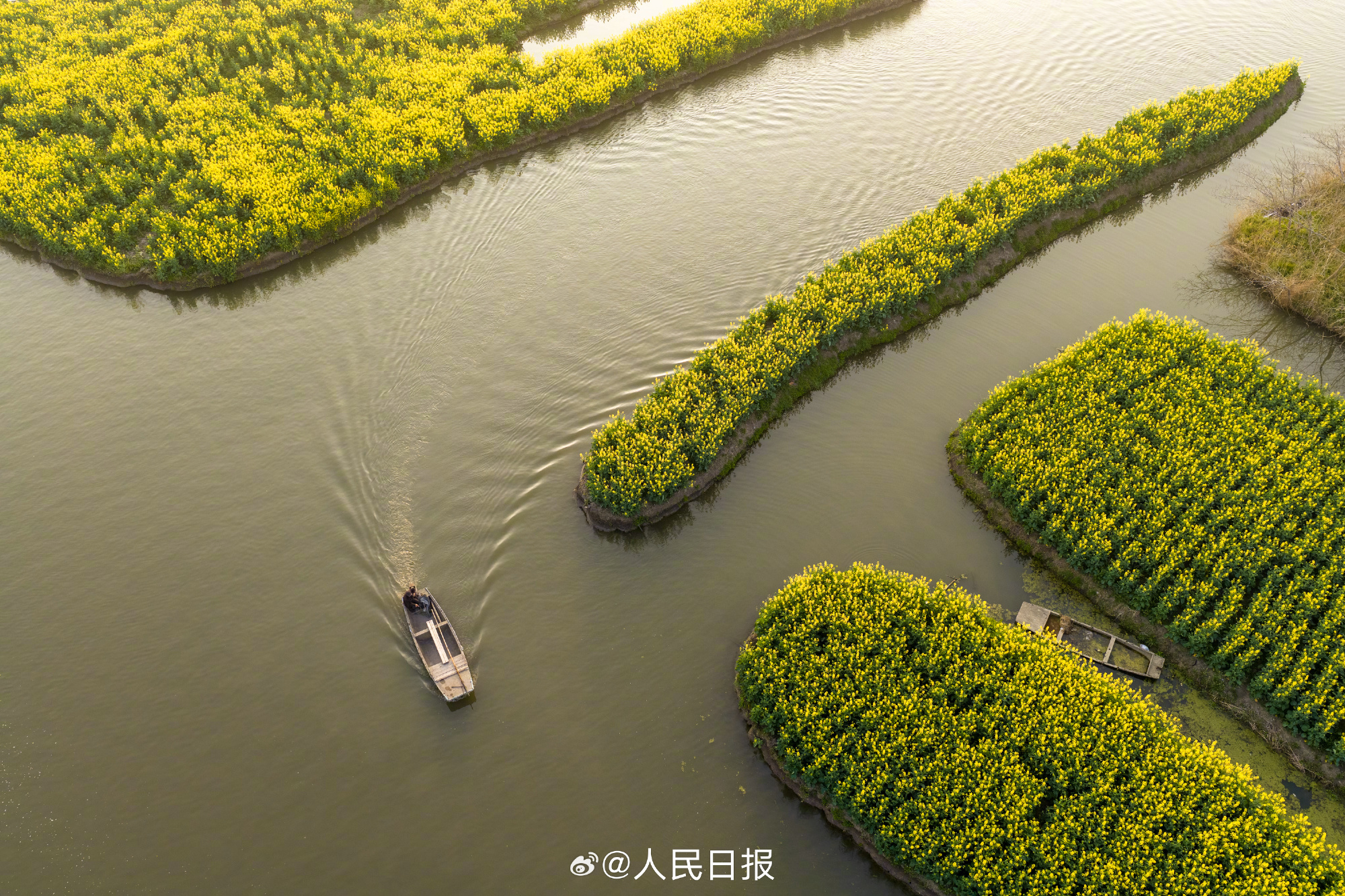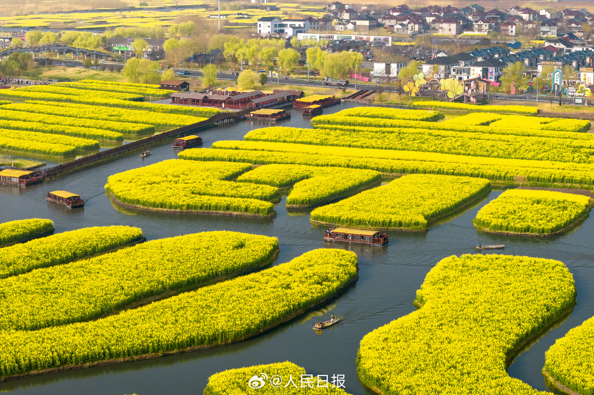 29日,江苏兴化千垛景区迎来今春盛放时刻。油菜花海进入全盛期,纵横交错的垛田如金色棋盘浮于水面,与澄澈碧水相映成趣。