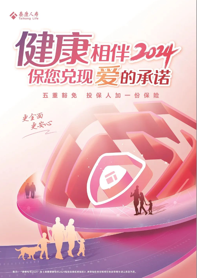 +豁免:健康相伴2024豁免险的加入,为客户提供了更加人性化的保障。这款豁免险覆盖了投保人轻症、中症、重疾、高残、身故五大豁免情形,一旦投保人遭遇不幸,被豁免合同的后续保费将自动豁免,被豁免合同继续有效,确保被豁免合同被保人的保障不受影响。这一设计为客户解除一定后顾之忧,体现了泰康人寿对客户的人性化关怀。
