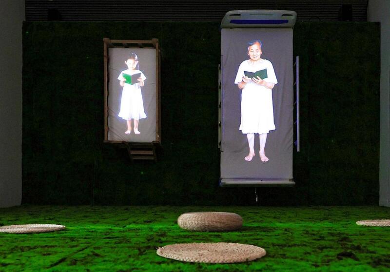 “看见美好”将艺术与公益共鸣的氛围拉满,设计师刘洋的《彼时此刻》成为连接纽带,以日常物与多媒体融合,构建出一个意境美好的诗意空间,并借助AI技术创作了“一老一小”两位女性的生命影像与声音,让人沉浸“彼时”与“此刻”的共存。