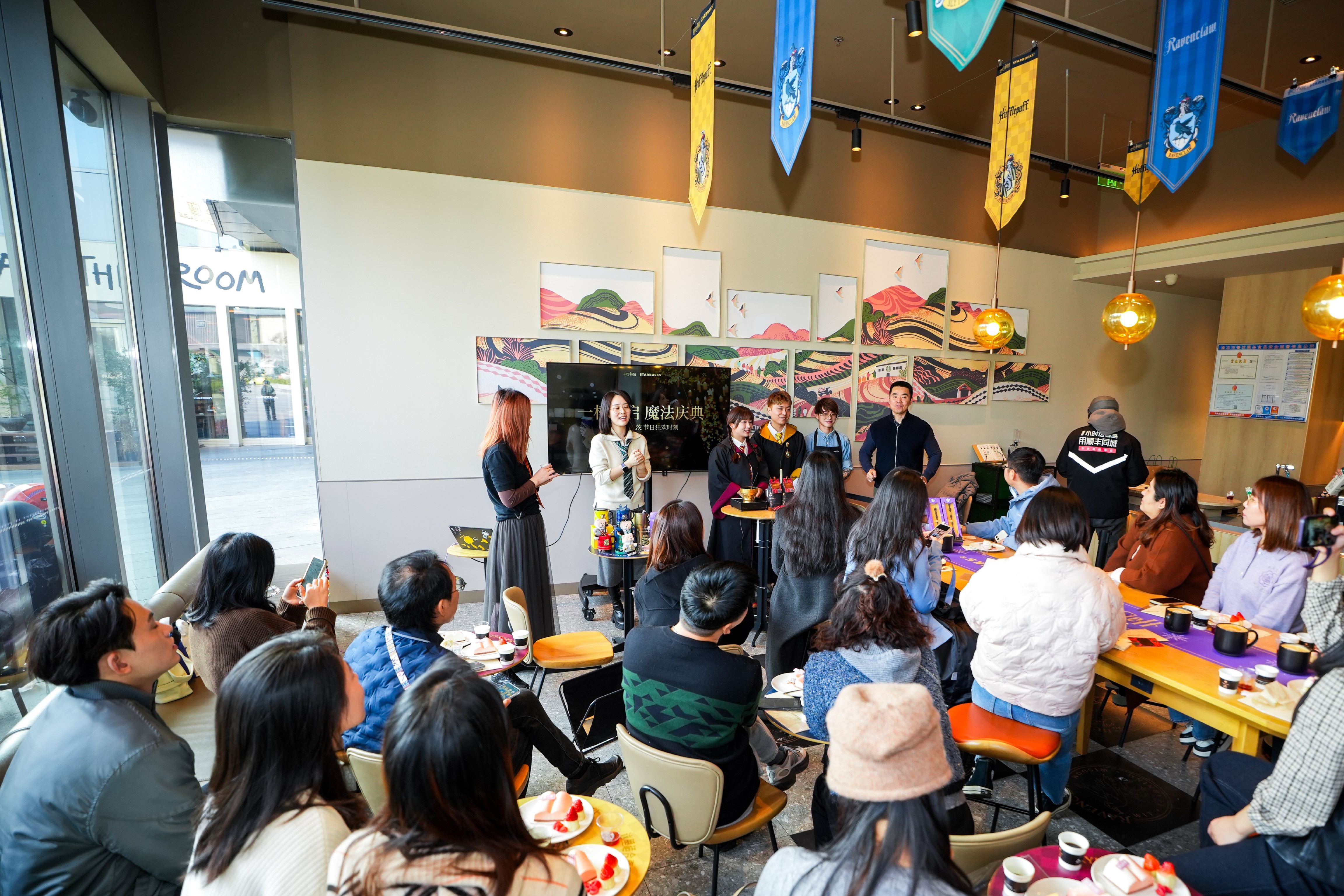 星巴克还借助自身第三空间的优势,于门店内外呈现魔法主题场景。广州沙面店直接“变身”为主题店:门店外,海德薇衔信静候,冬日魔法庆典悄然启幕。穿越9¾站台红砖拱门,顾客可以在魔法报纸装置前获取自己的冬日魔法头条。推开“城堡大门”走进店内,映入眼帘的便是学院旗、悬浮杯、金色烛海交织的庆典现场。你可以在大厅享用魔法主题咖啡,打卡飞天扫帚,邂逅漂浮的魔法信函与魔法行李箱;或是探访庆典魔杖店,点亮互动烛台。公共休息室的魔镜前,可以和你的魔法搭子互相PK庆典穿搭,亦或是穿梭至二楼在壁炉前举杯庆祝节日。