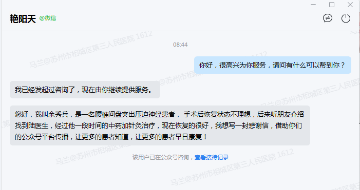 患者余女士是一名腰椎间盘突出压迫神经患者,今年4月6日在上海做了手术,手术后部分神经受损严重,恢复状态不理想。“其实当时我的心态很糟糕,那种躺在床上想动动不了的感觉真的要让人崩溃,”这是余女士当时的心路历程。在朋友的介绍下,余女士于4月23日来到苏州市相城区第三人民医院中医骨伤科陆青医生处就诊,这是她幸运的开始。
